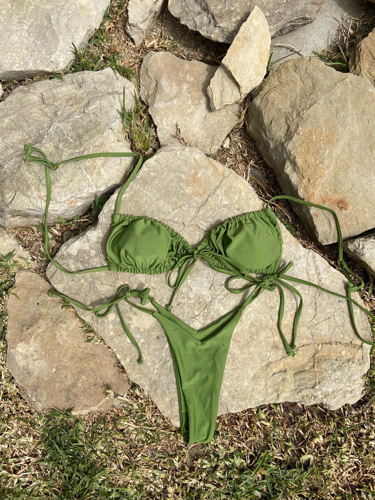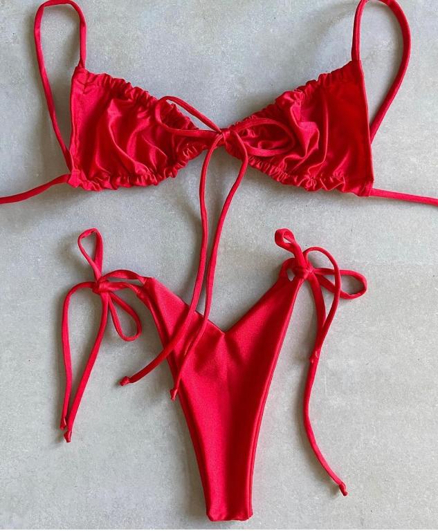 Haut triangle avec détail froncé et lien central ajustable. Bretelles fines réglables.